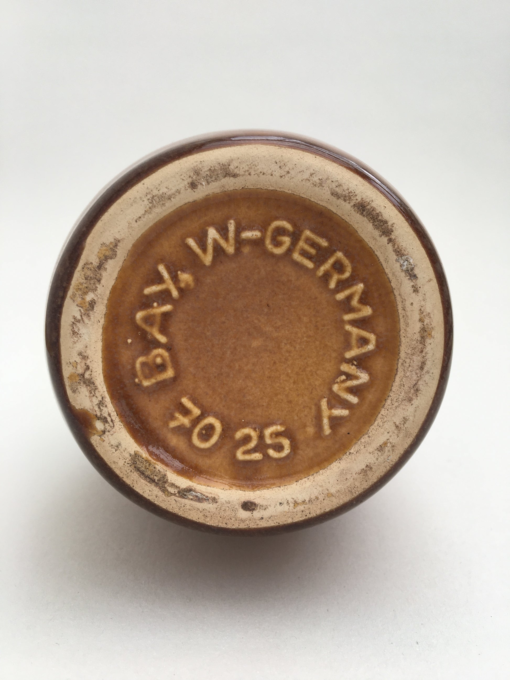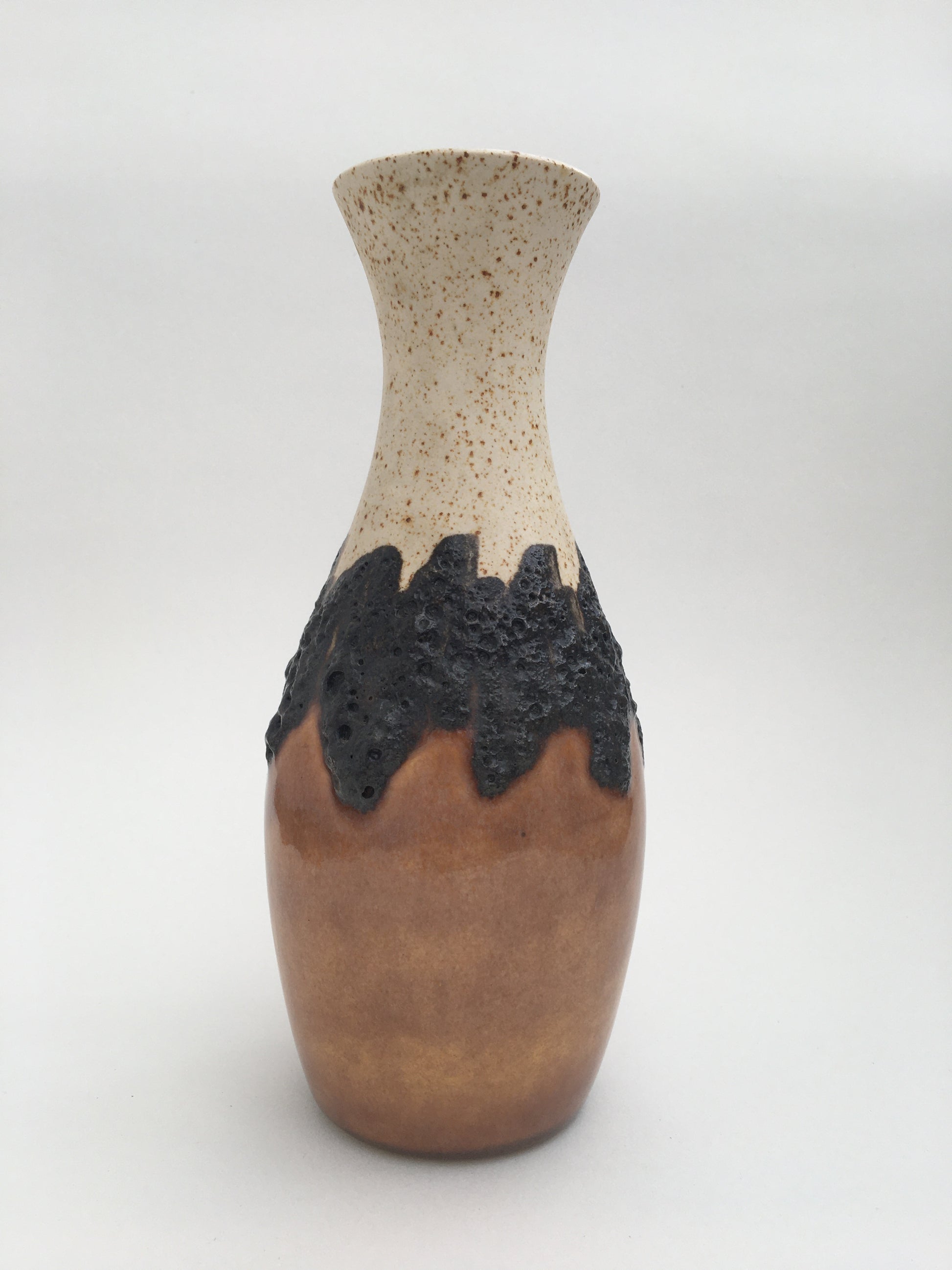 A mid century, fat lava vase manufactured by Bay Keramik in West Germany. Thick lava glaze middle with speckled cream top & earth tone bottom. Marked underneath with the maker 'Bay, W-Germany' & the model number '7025'.