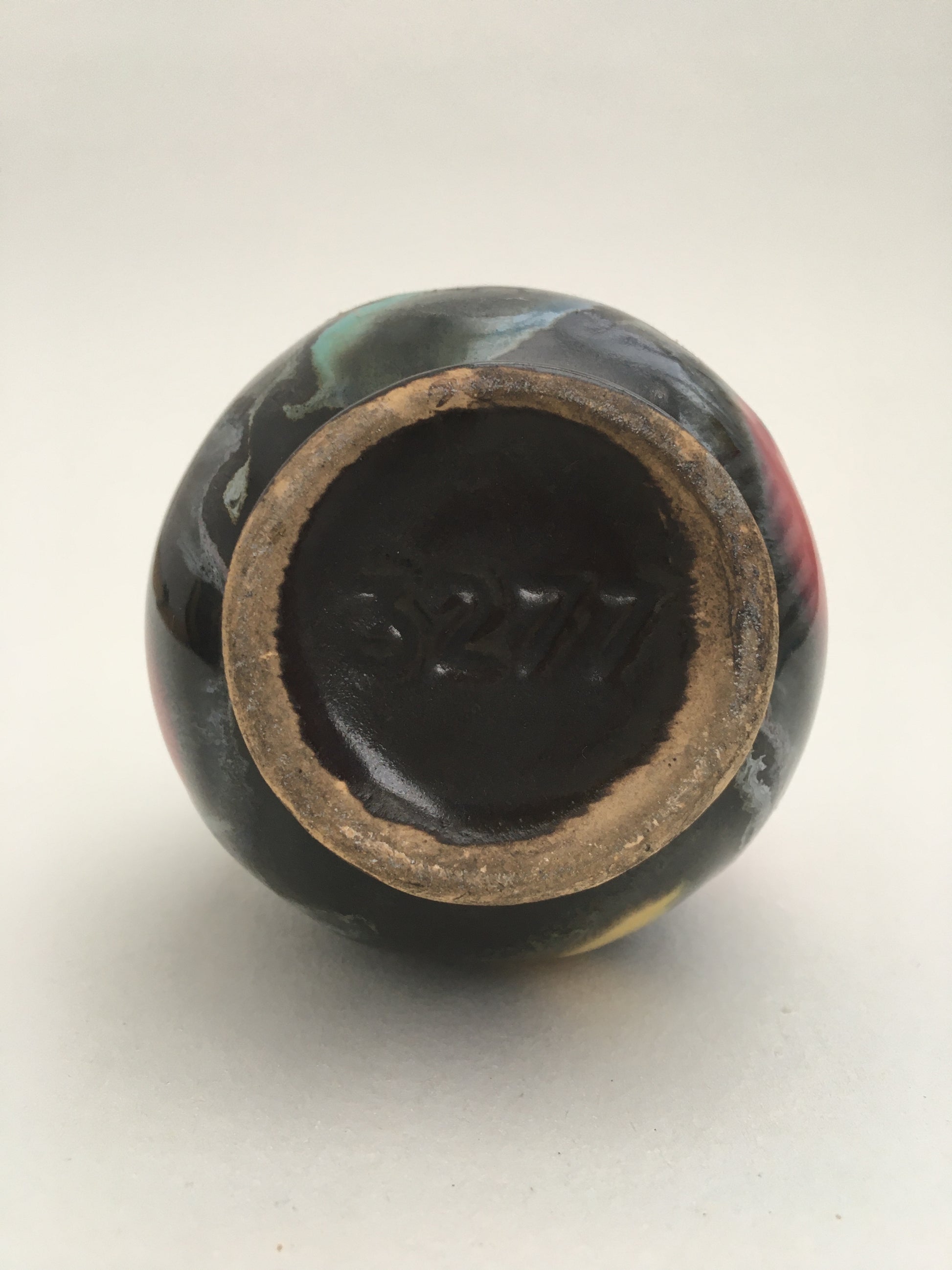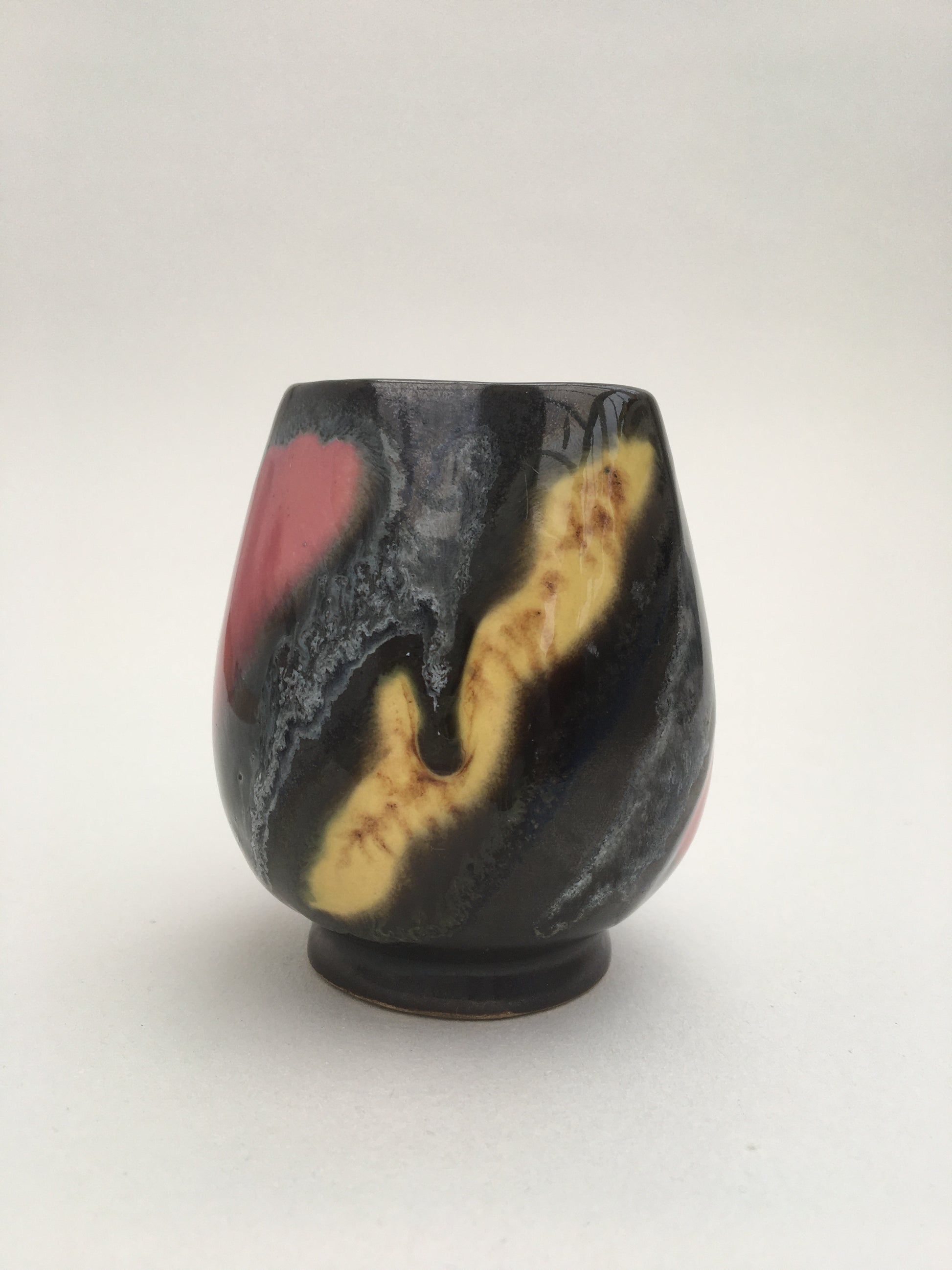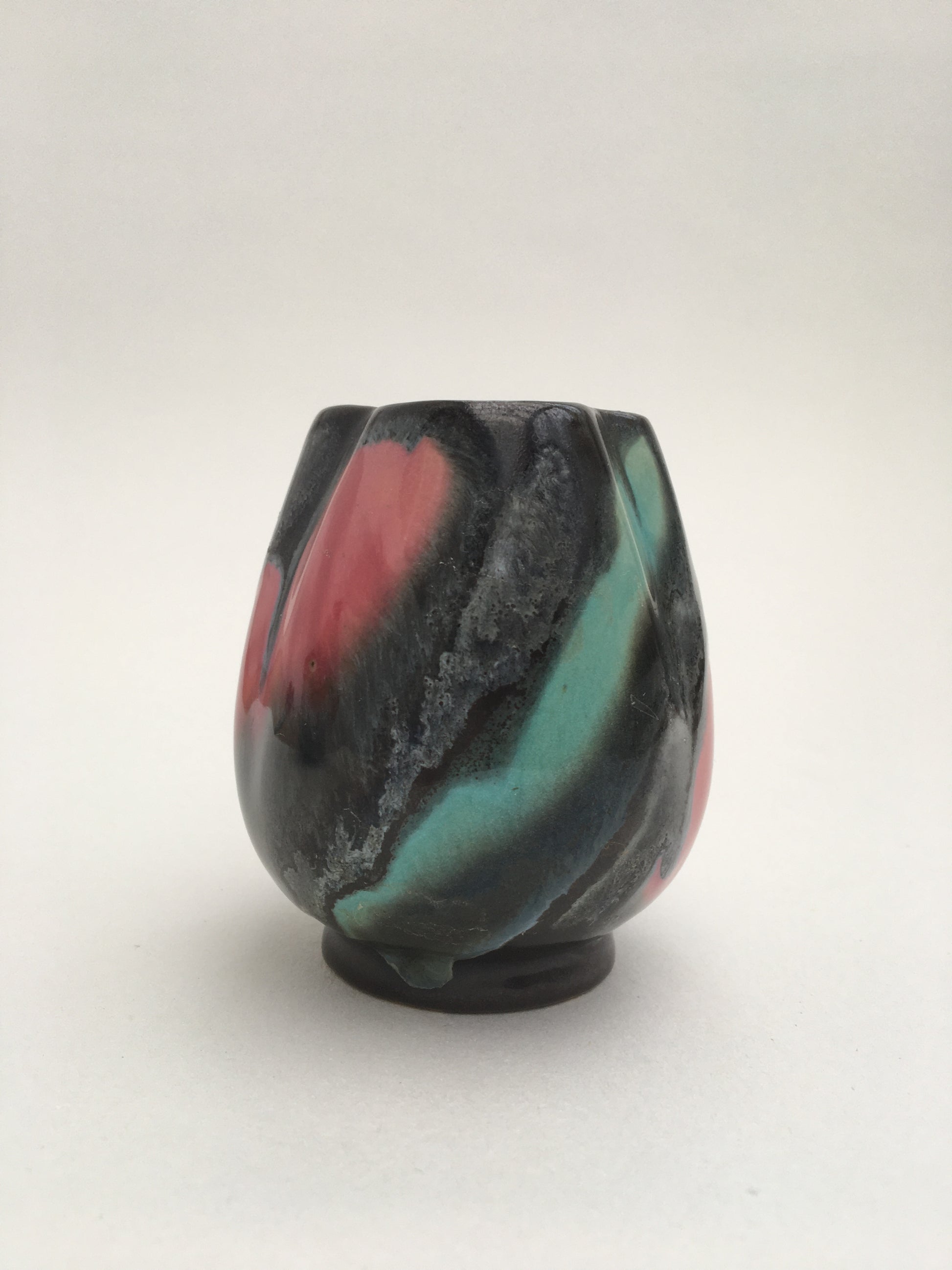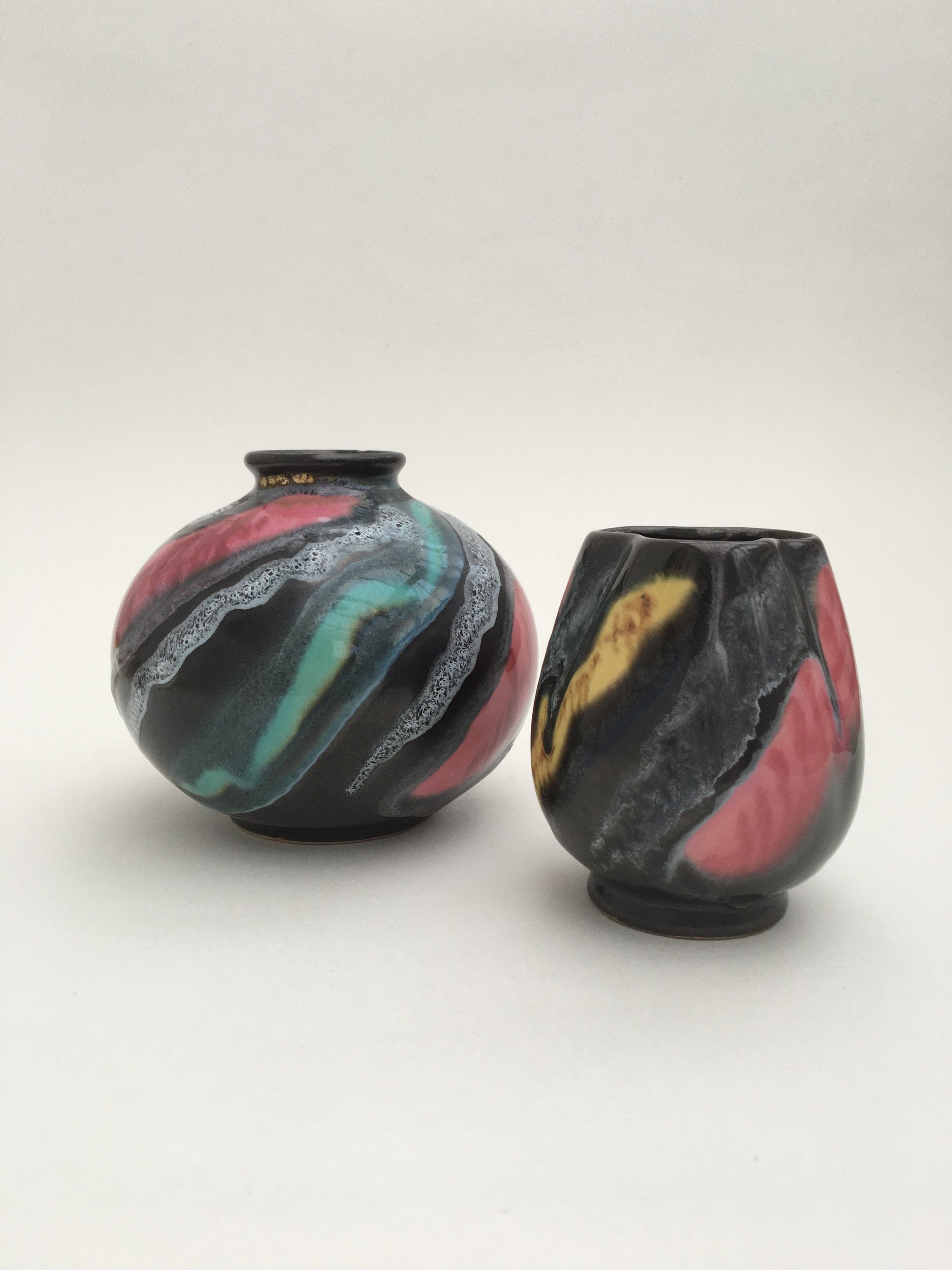 A pair of mid-century bud vases by VEB Haldensleben, made in East Germany. Decorated with red, yellow & green glazes. Model numbers '7032' & '3277'.