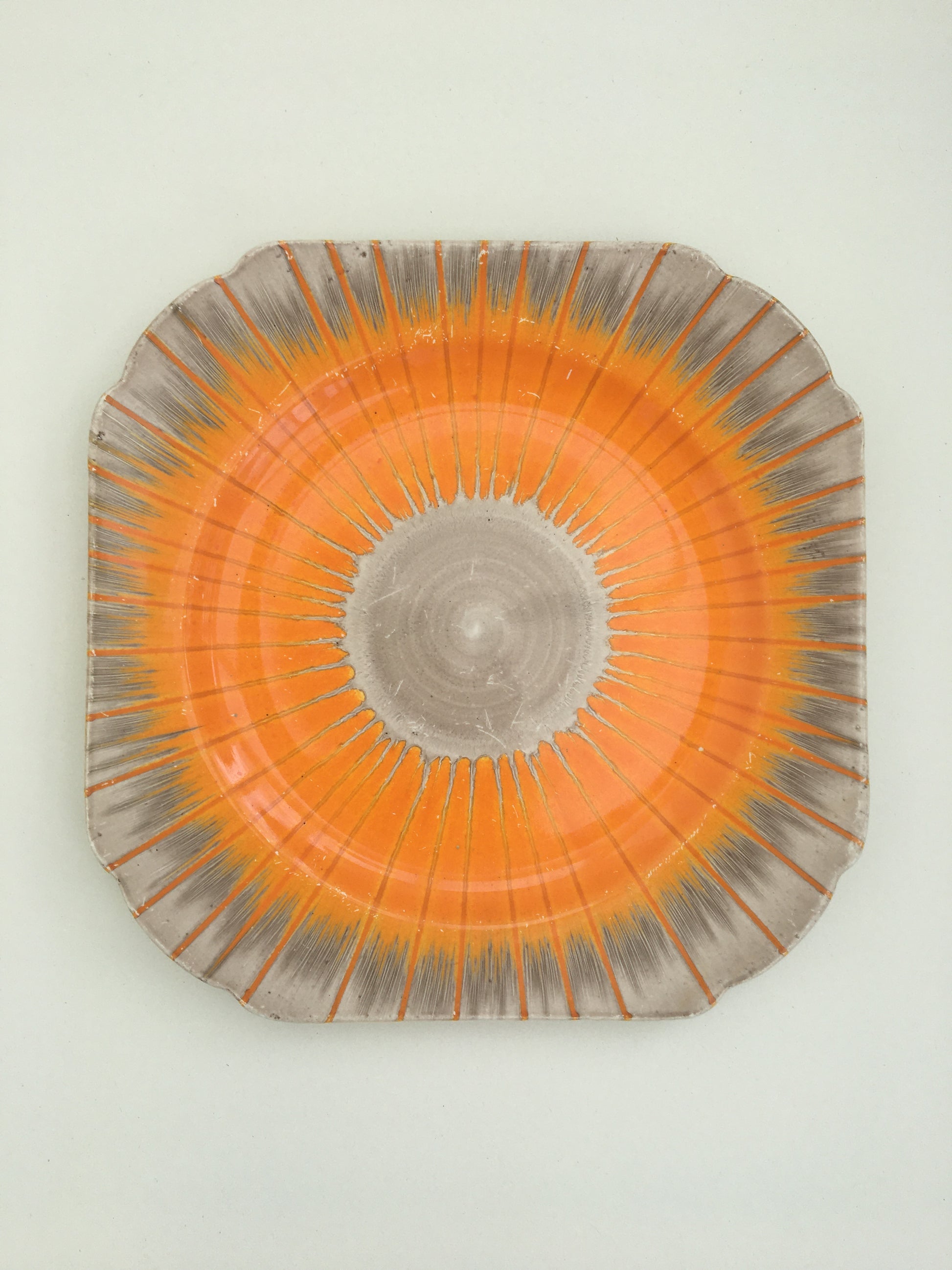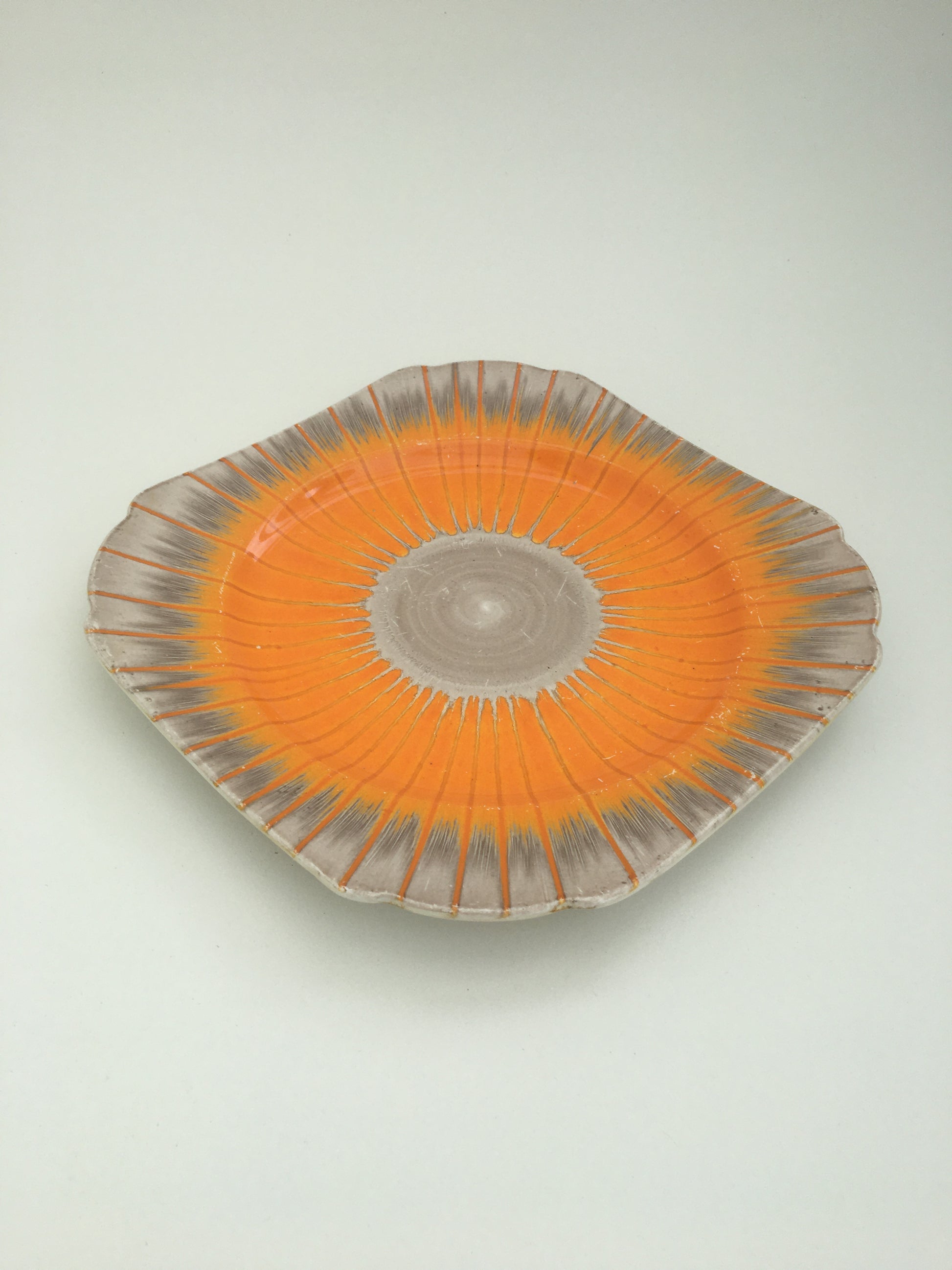 An art deco Shelley Harmony drip ware plate with a colourful sunburst design, circa late 1930s.