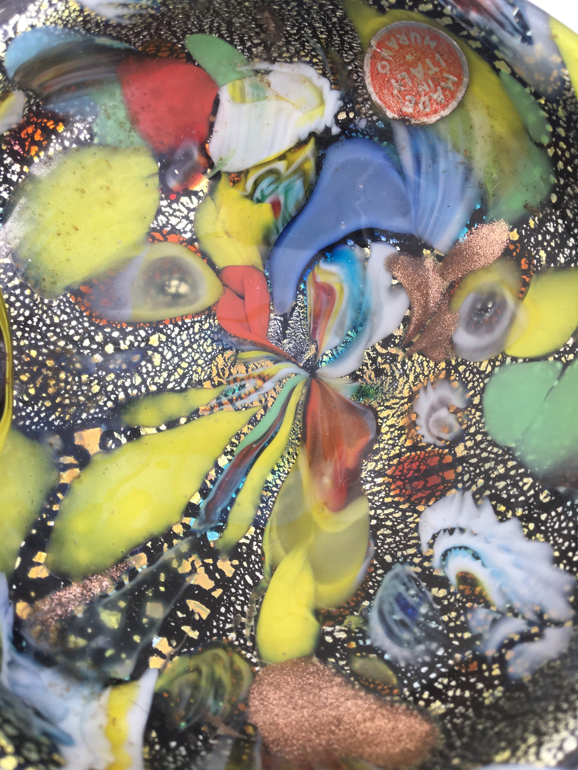 A kidney shaped, tutti-frutti Murano glass bowl with black base, made by AVeM. Includes authentic 'Made In Italy, Murano' sticker.